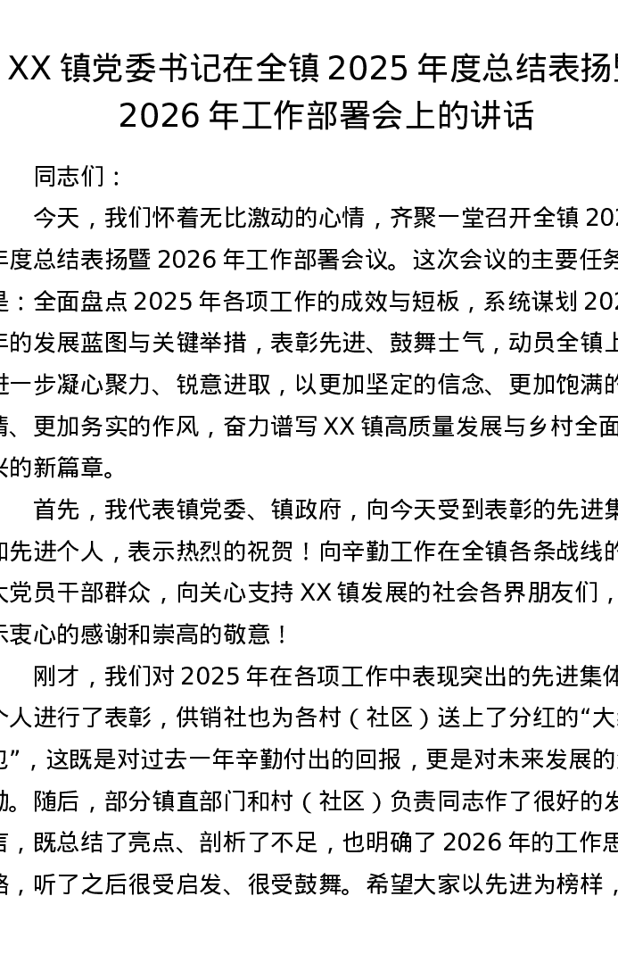 XX镇党委书记在全镇2025年度总结表扬暨2026年工作部署会上的讲话