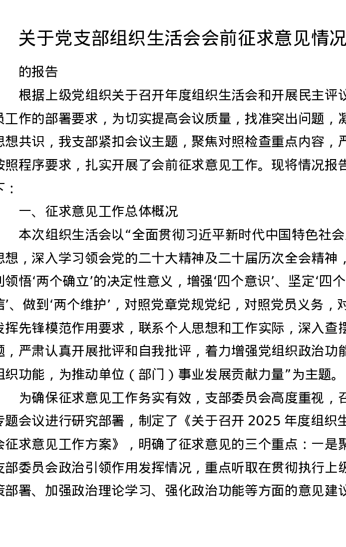 关于党支部组织xxx会前征求意见情况的报告(4321字)