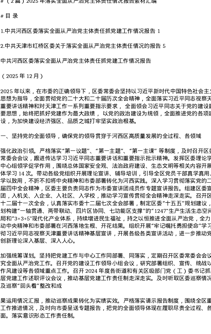 汇编:2025年落实全面从严治党主体责任情况报告素材2篇