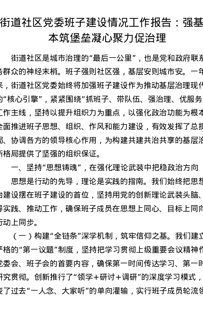 街道社区党委班子建设情况工作报告:强基固本筑堡垒 凝心聚力促治理