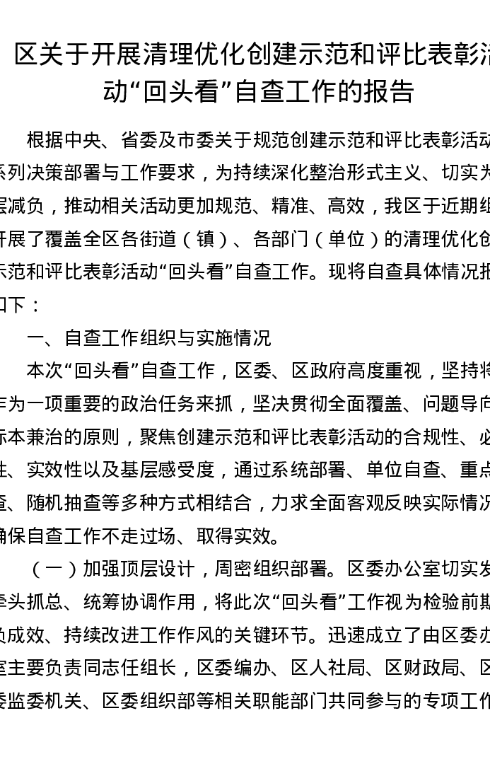 区关于开展清理优化创建示范和评比表彰活动回头看自查工作的报告