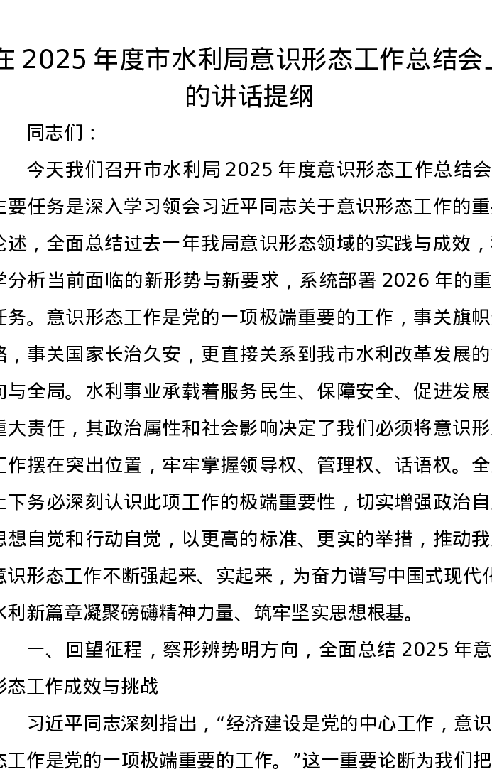 在2025年度市水利局意识形态工作总结会上的讲话提纲