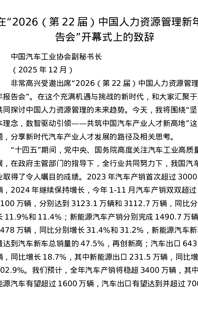 在2026(第22届)中国人力资源管理新年报告会开幕式上的致辞