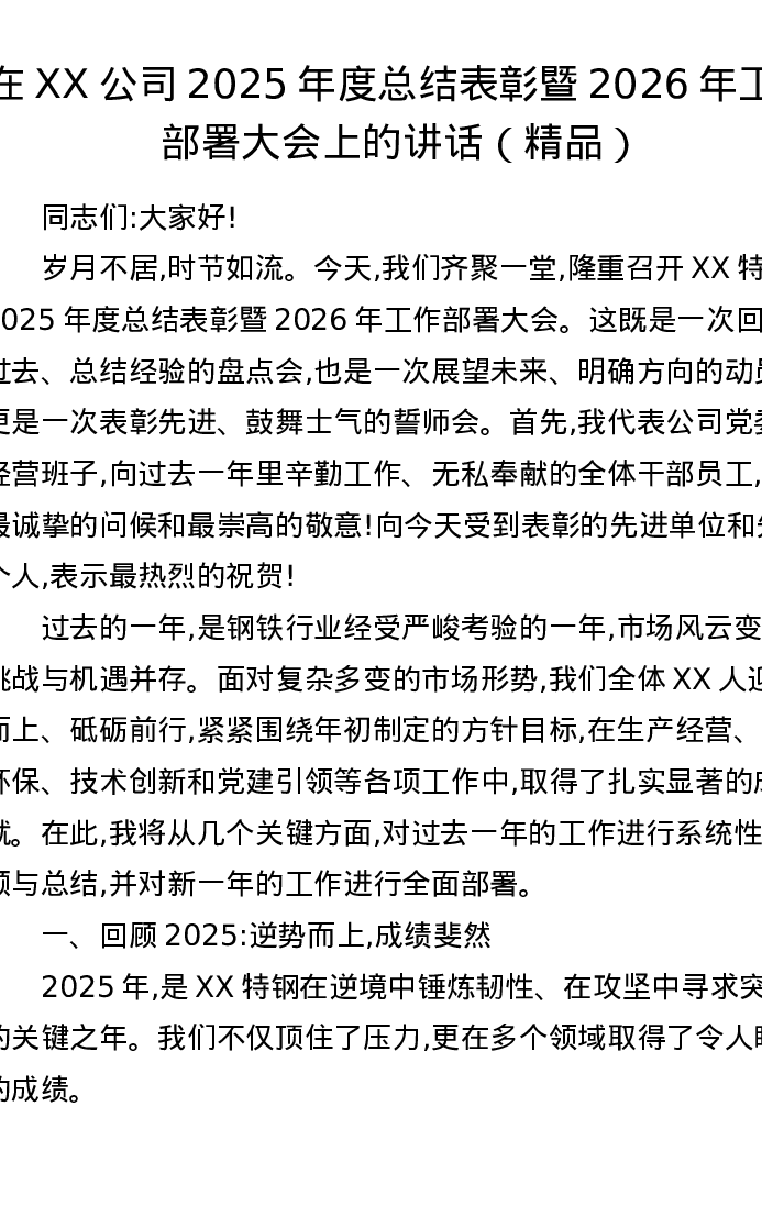 在XX公司2025年度总结表彰暨2026年工作部署大会上的讲话