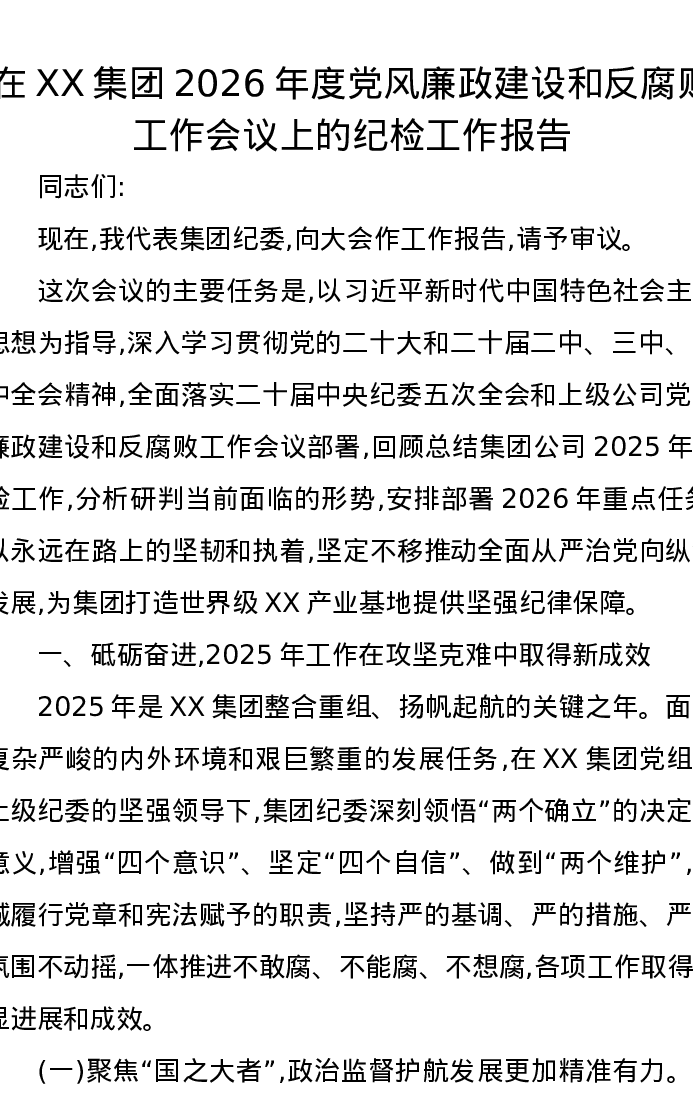 在XX集团2026年度党风廉政建设和反腐败工作会议上的纪检工作报告