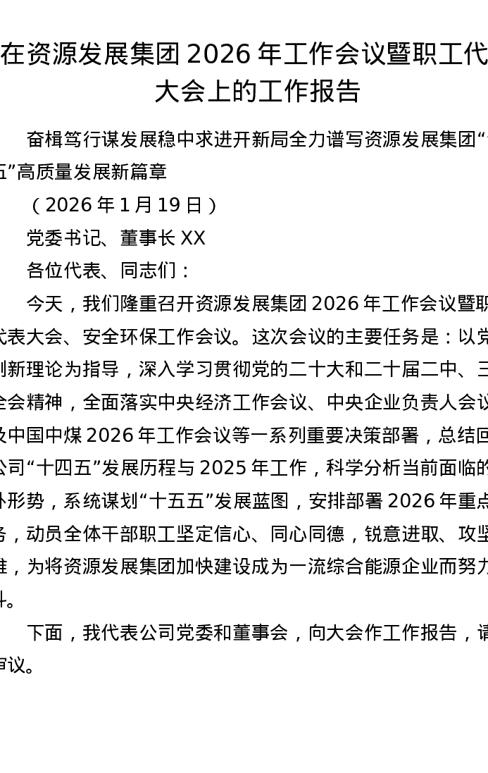在资源发展集团2026年工作会议暨职工代表大会上的工作报告