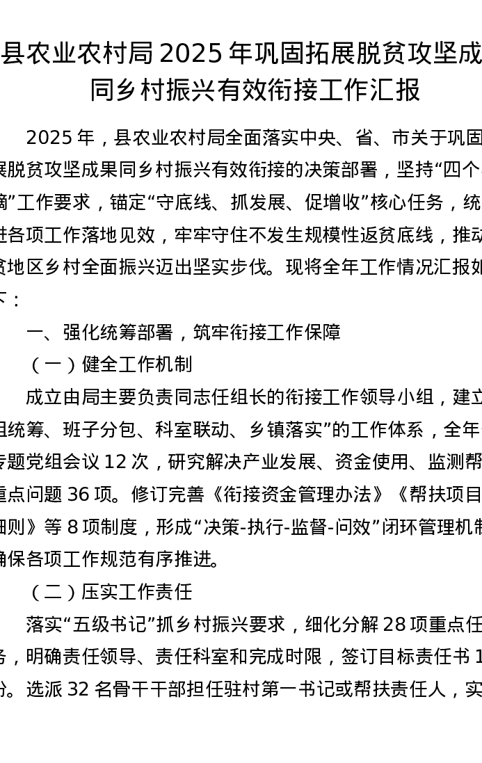 县农业农村局 2025 年巩固拓展脱贫攻坚成果同乡村振兴有效衔接工作汇报