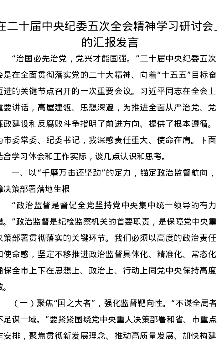 在二十届中央纪委五次全会精神学习研讨会上的汇报发言