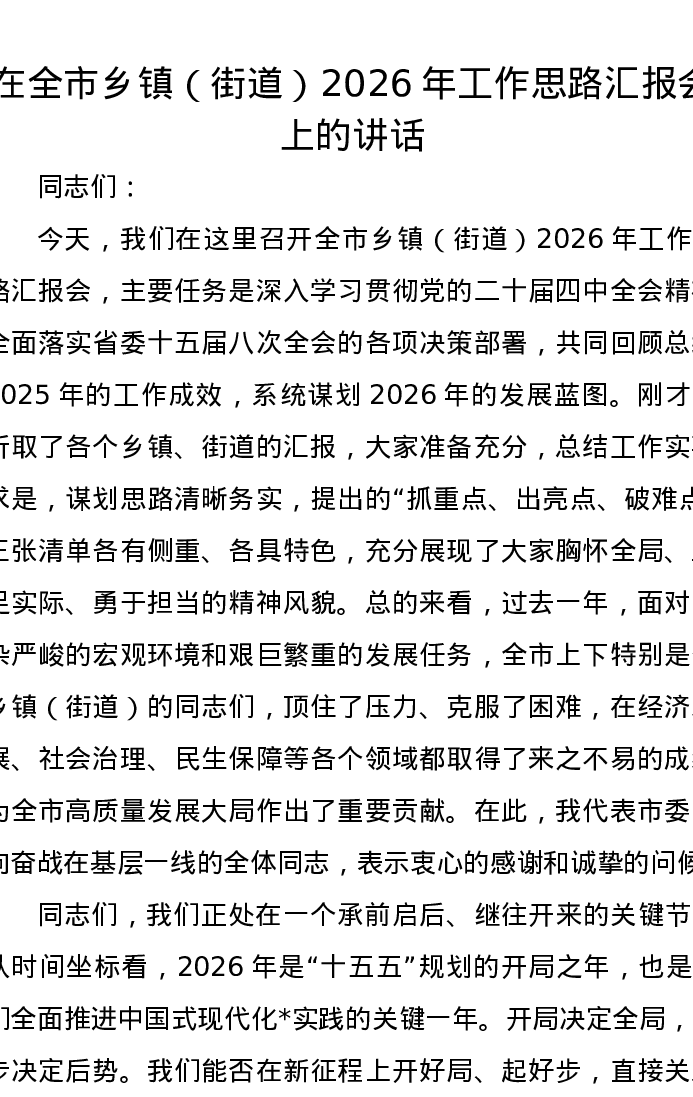 在全市乡镇(街道)2026年工作思路汇报会上的讲话