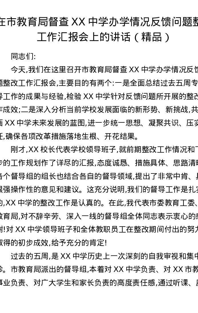 在市教育局督查XX中学办学情况反馈问题整改工作汇报会上的讲话
