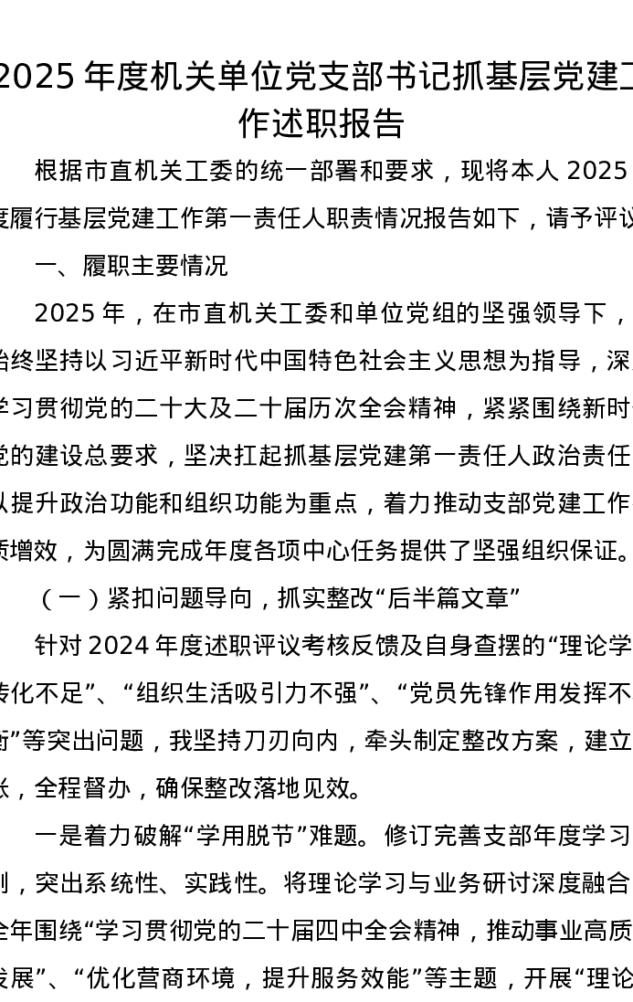 2025年度机关单位党支部书记抓基层党建工作述职报告