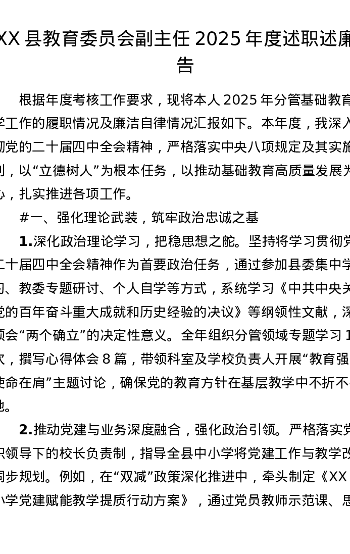XX县教育委员会副主任2025年度述职述廉报告(1708字)