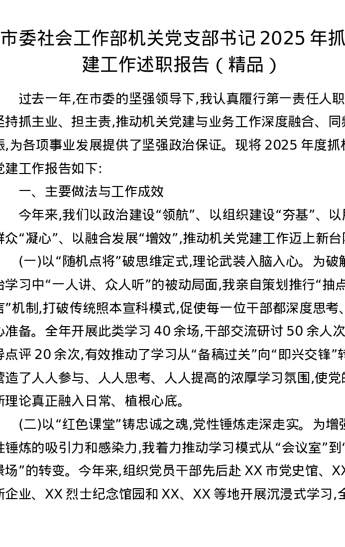 市委社会工作部机关党支部书记2025年抓党建工作述职报告