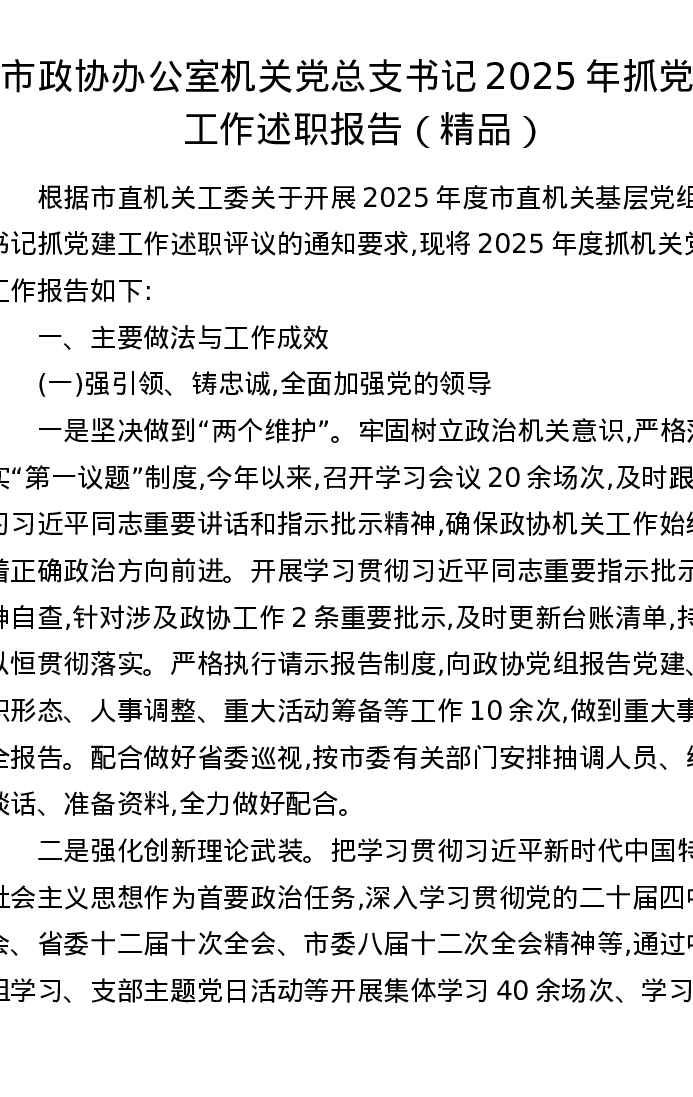 市政协办公室机关党总支书记2025年抓党建工作述职报告