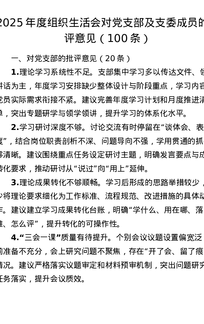2025年度组织xxx对党支部及支委成员的批评意见(100条)