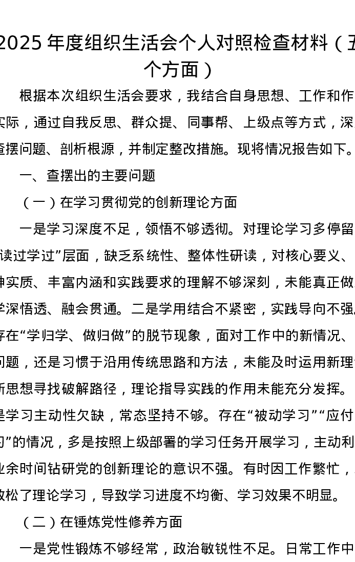 2025年度组织xxx个人对照检查材料(五个方面)