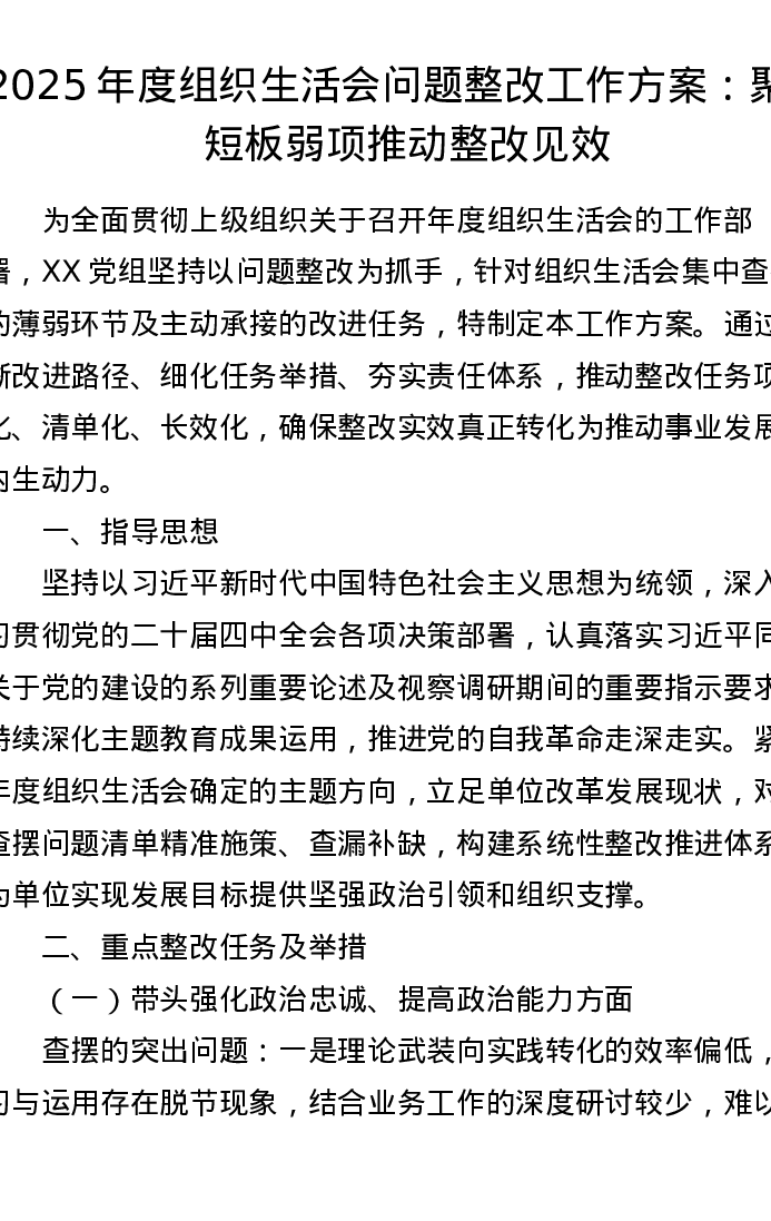 2025年度组织xxx问题整改工作方案:聚焦短板弱项 推动整改见效