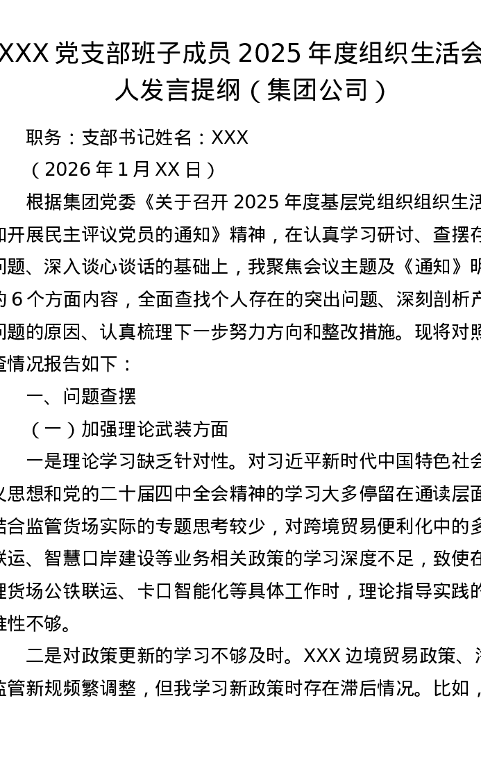 XXX党支部班子成员2025年度组织xxx个人发言提纲(集团公司)