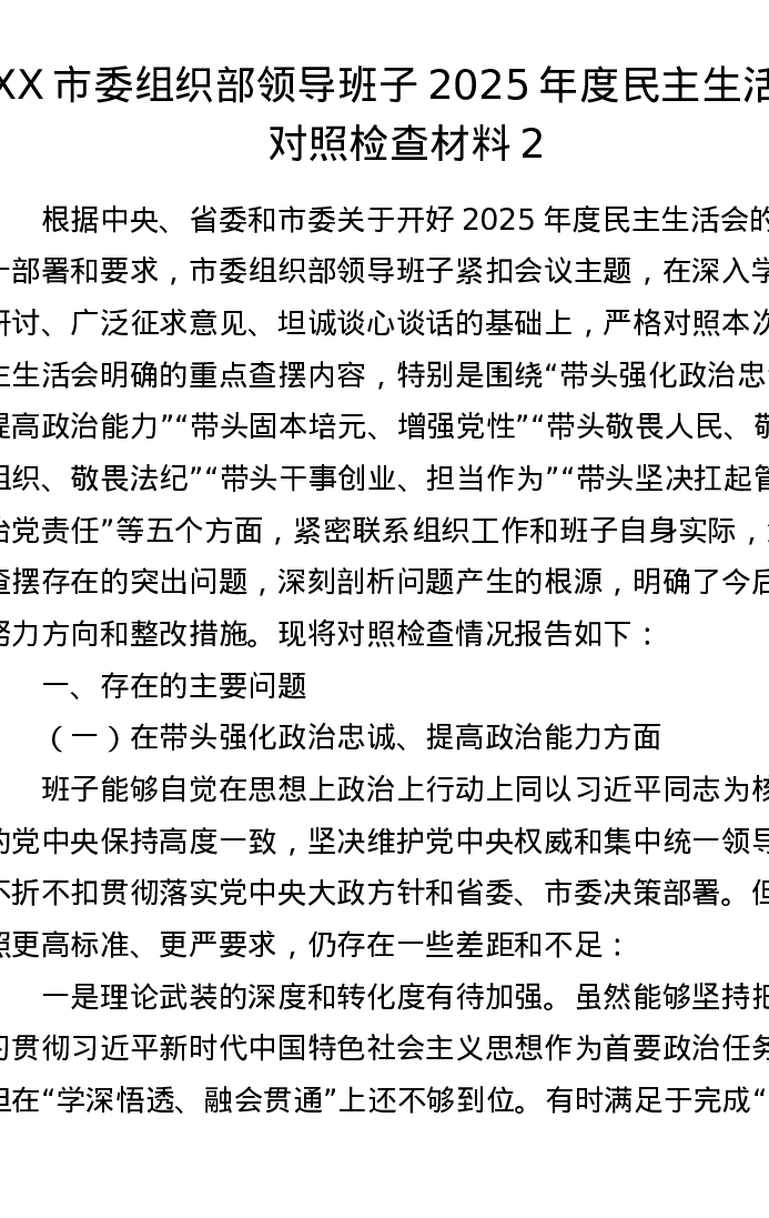 XX市委组织部领导班子2025年度xxxxx对照检查材料2
