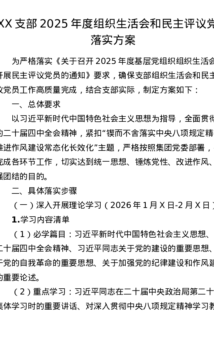 XX支部2025年度组织xxx和民主评议党员落实方案