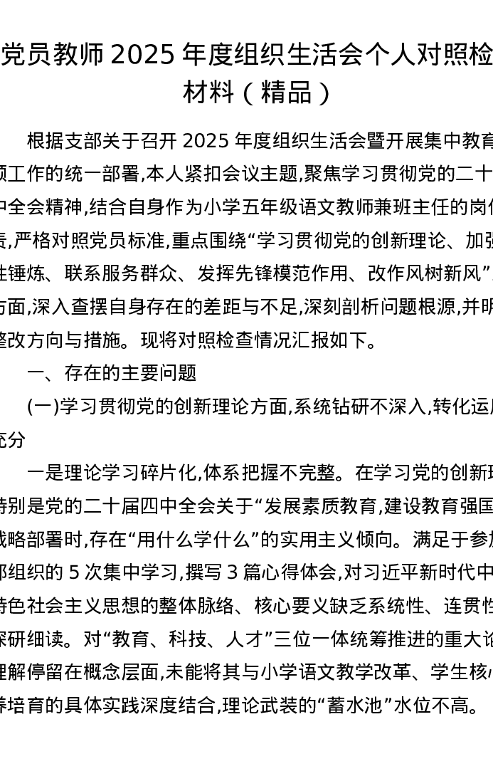 党员教师2025年度组织xxx个人对照检查材料