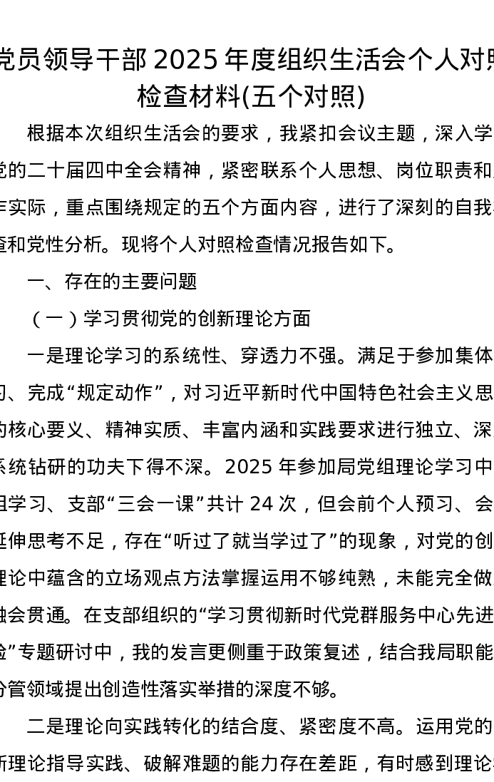 党员领导干部2025年度组织xxx个人对照检查材料(五个对照)