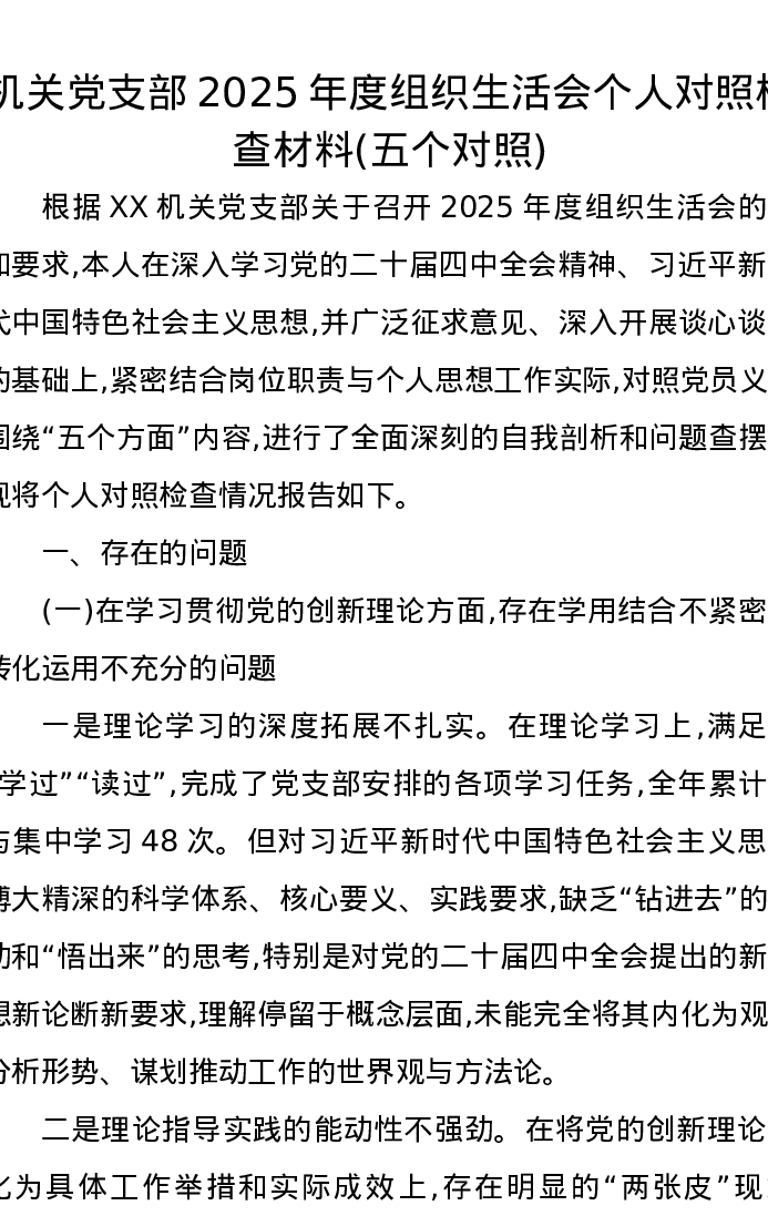 机关党支部2025年度组织xxx个人对照检查材料(五个对照)2