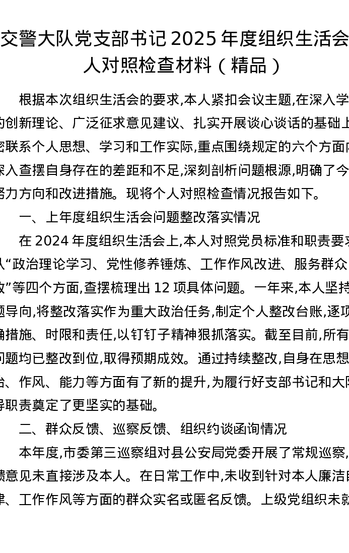 交警大队党支部书记2025年度组织xxx个人对照检查材料