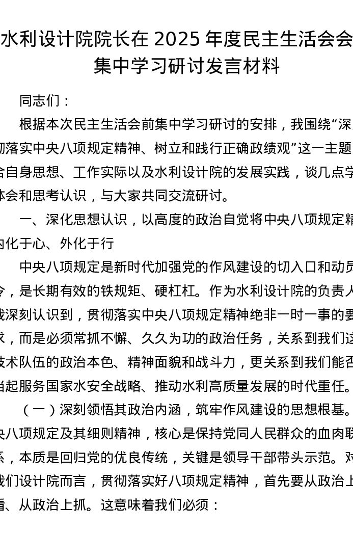 水利设计院院长在2025年度xxxxx会前集中学习研讨发言材料
