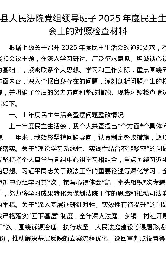 县人民法院党组领导班子2025年度xxxxx上的对照检查材料