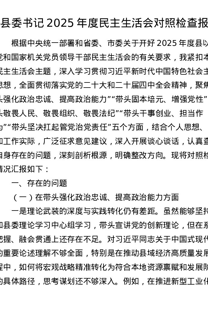 县委书记2025年度xxxxx对照检查报告
