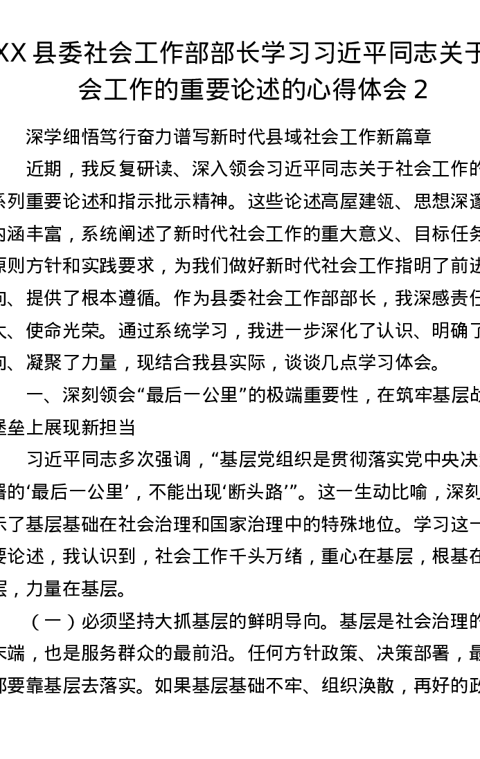 XX县委社会工作部部长学习总书记关于社会工作的重要论述的心得体会2