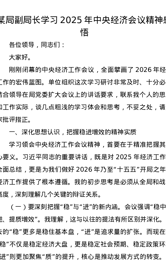 某局副局长学习2025年中央经济会议精神感悟