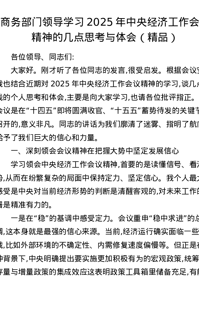 商务部门领导学习2025年中央经济工作会议精神的几点思考与体会