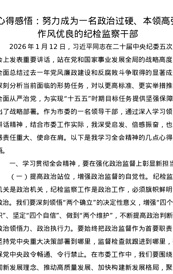 心得感悟:努力成为一名政治过硬、本领高强、作风优良的纪检监察干部