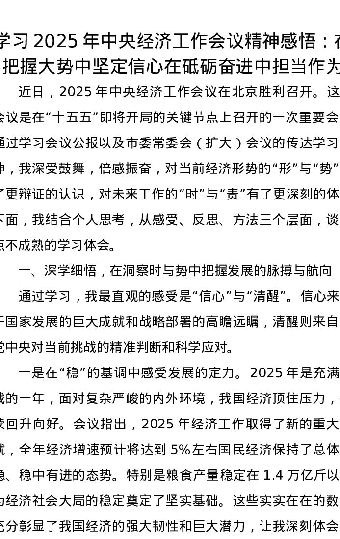 学习2025年中央经济工作会议精神感悟:在把握大势中坚定信心在砥砺奋进中担当作为