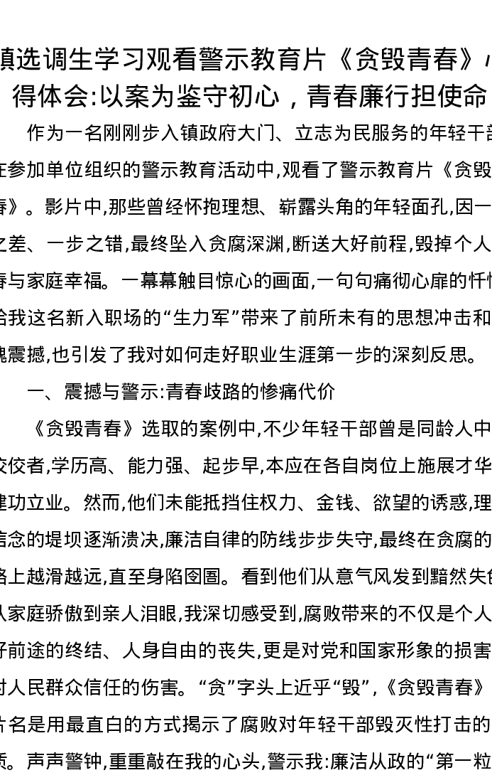 镇选调生学习观看警示教育片《贪毁青春》心得体会以案为鉴守初心,青春廉行担使命