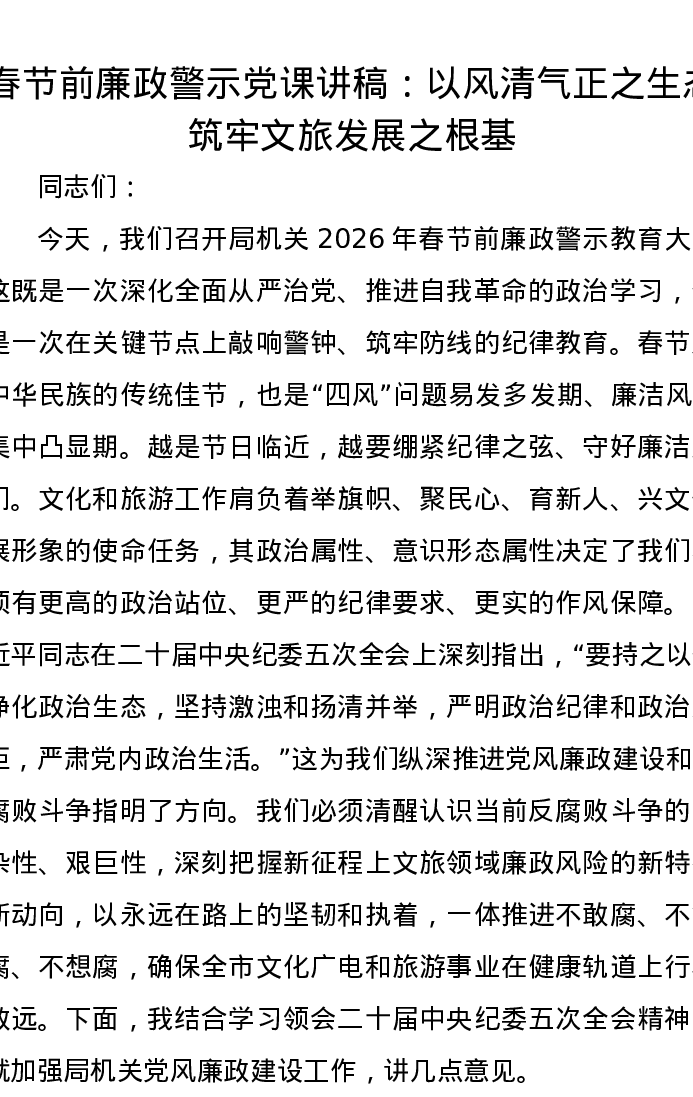 春节前廉政警示党课讲稿:以风清气正之生态筑牢文旅发展之根基