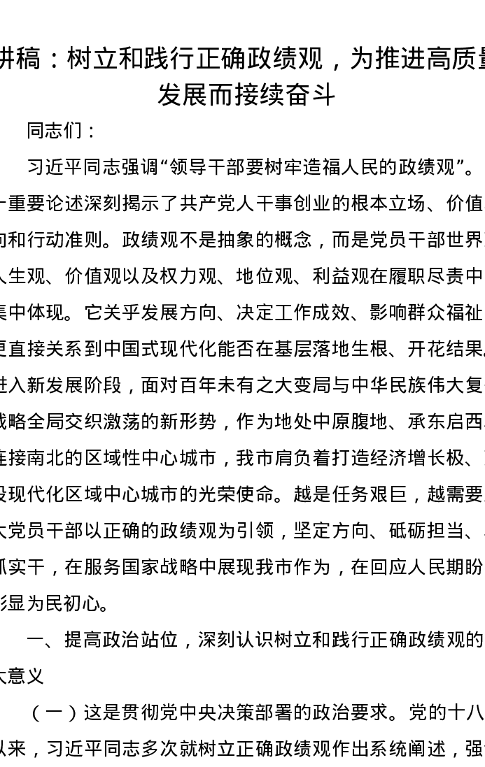 讲稿:树立和践行正确政绩观,为推进高质量发展而接续奋斗