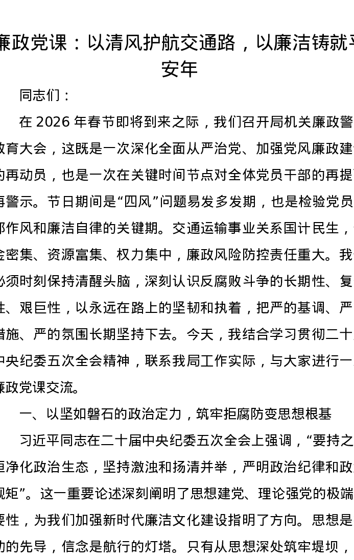 廉政党课:以清风护航交通路,以廉洁铸就平安年