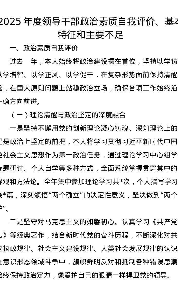 2025年度领导干部政治素质自我评价、基本特征和主要不足