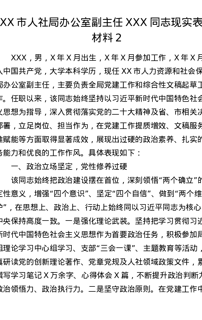 XX市人社局办公室副主任XXX同志现实表现材料2