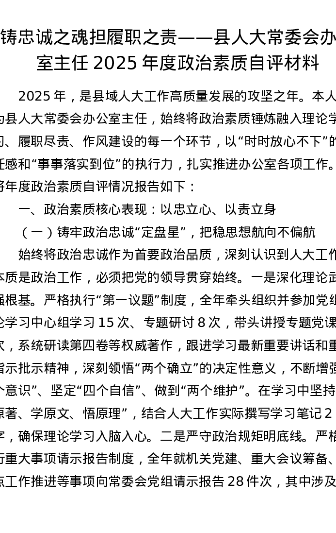 铸忠诚之魂 担履职之责——县人大常委会办公室主任2025年度政治素质自评材料