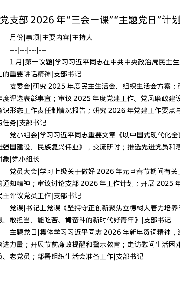 党支部2026年三会一课主题党日计划表