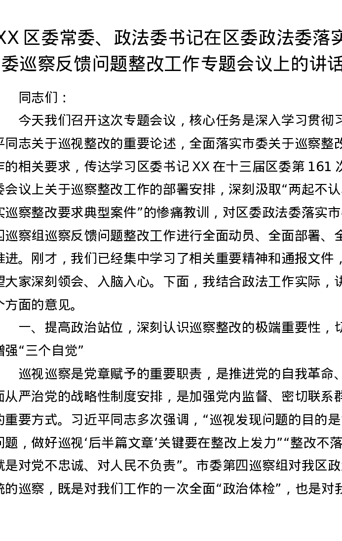 XX区委常委、政法委书记在区委政法委落实市委巡察反馈问题整改工作专题会议上的讲话1