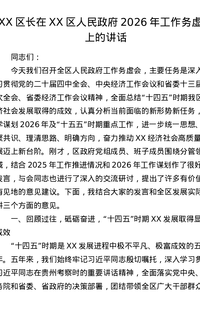 XX区长在XX区人民政府2026年工作务虚会上的讲话
