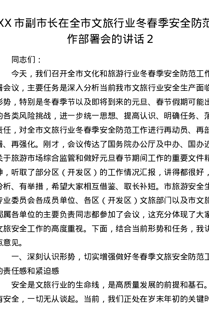 XX市副市长在全市文旅行业冬春季安全防范工作部署会的讲话2