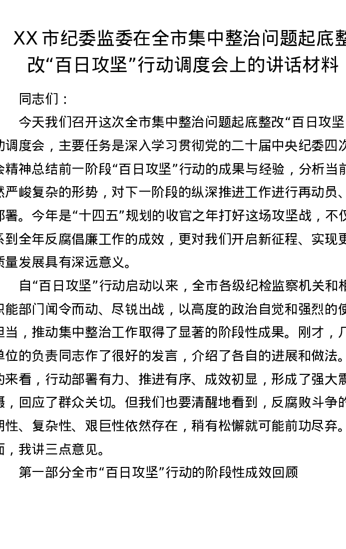 XX市纪委监委在全市集中整治问题起底整改百日攻坚行动调度会上的讲话材料