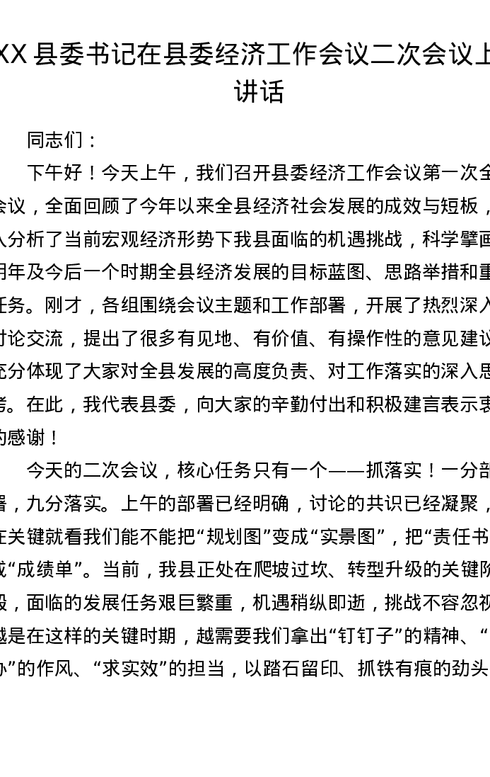 XX县委书记在县委经济工作会议二次会议上的讲话