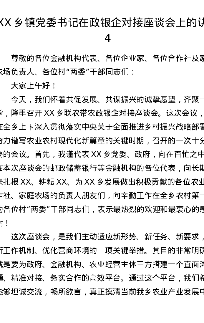 XX乡镇党委书记在政银企对接座谈会上的讲话4